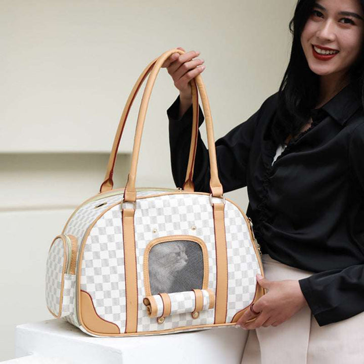 Checker Print Designer Pet Carrier with Pockets and Screen